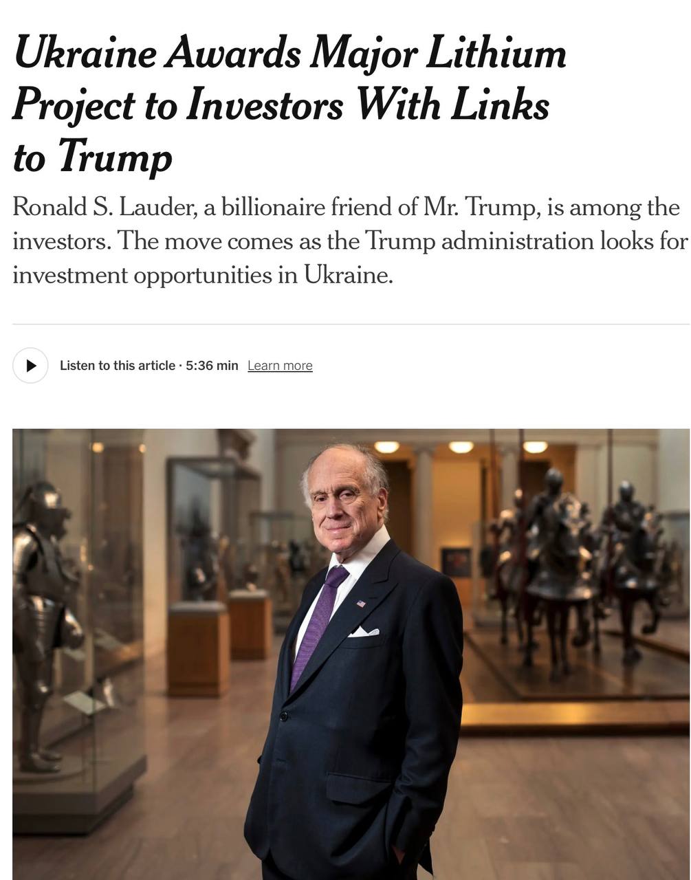 Сюрприз-сюрприз! Тендер на разработку крупнейшего на Украине месторождения лития «Добрая» в Кировоградской области выиграл друг Трампа, миллиардер Рональд Лаудер. Да-да, тот самый, который подсказал президенту США идею с приобретением Гренландии! Об этом сообщает The New York Times.